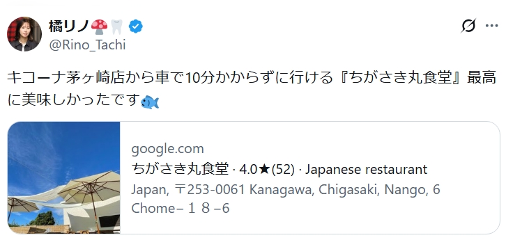 橘リノ(おそらくアイドル橘リノ)がXで絶賛した茅ヶ崎の「ちがさき丸食堂」は、釣り船「ちがさき丸」併設の人気店。