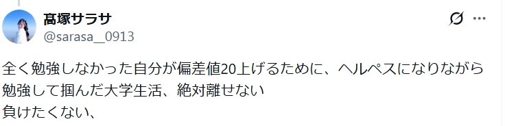 高校時代、勉強不足だった高塚サラサは猛勉強の末に偏差値20向上させ、大学進学を果たしました。X投稿では「ヘルペスになりながら勉強」と過酷さを表現し、その努力を芸能活動継続の原動力にしています。